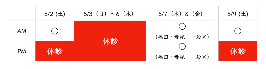 5月3日(日)~6日(水)をGW休診とさせていただきます。